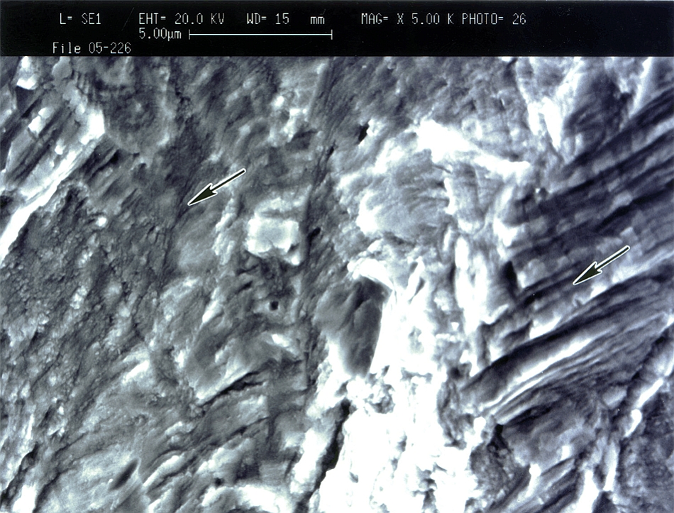 Optical microscopic examination of the 4th stage rotor blade fractures revealed overload features consistent with secondary damage. However, one of the three 4th stage rotor blades that failed closer to the blade root did show what appeared to be macroscopic features of cyclic overload fracture. This blade fracture was sectioned from the rotor for SEM examination at higher magnifications. Examination revealed only overload fracture features and surface rub patterns, but gave the false appearance of cyclic steps when viewed at lower magnifications.