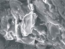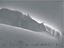Photos 9 and 10 are SEM images of impact mark at 1st stage rotor bladeleading edge showing the presence of a small imbedded particle.