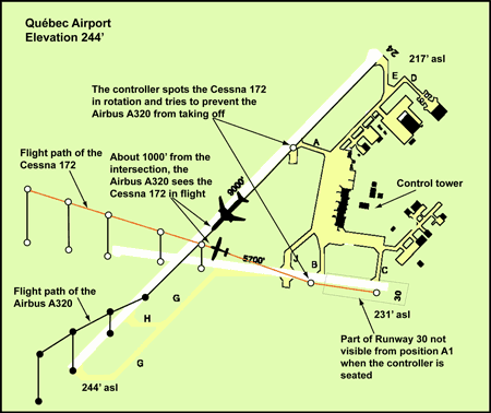 Québec Airport is a controlled airport with two runways: Runway 06/24 is 9000 feet long and 150 feet wide, and Runway 12/30 is 5700 feet long and 150 feet wide. The runways intersect 5800 feet from the threshold of Runway 24 and 4300 feet from the threshold of Runway 30. Because the airport facilities are located between the two runways, a pilot on Runway 24 cannot see the threshold of Runway 30 until the aircraft is approximately 2900 feet from the threshold of Runway 24.