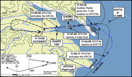 - On the first approach at Gaspé, the pilot did not follow the published missed approach procedure, which reduced the obstacle clearance.
