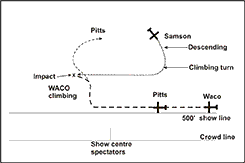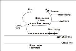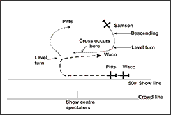 - The timing of the manoeuvre was lost when the Waco turned late at show centre.