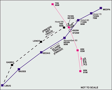 The route of ACA015 crossed the NSiT FRN 324 route for DLH492 at 7018N 8819W; this is the route cross position at which NSiT conflict probes for ACA015 and DLH492 were based. In fact, the route of ACA015 crossed the actual route of DLH492 (FRN 322) at 6925N 8725W (see Appendix B). Calculations later determined that DLH492 passed this position at 1114 and that ACA015 passed this position 10 minutes later at 1124. The required separation, before and after the cross, was 15 minutes.