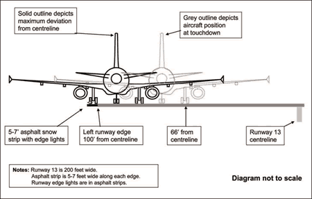 Investigators found skid marks on the runway indicating that the right main landing gear was about 66 feet left of the runway centreline at touchdown and that the aircraft was skidding to the left. Tracks made by the left wheel on snow and ice were no longer visible. Since the left and right main gear are approximately 25 feet apart, it was determined that the left main gear was approximately 91 feet from the runway centreline, 9 feet from the edge of the runway at touchdown.