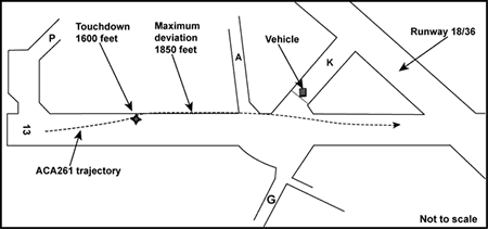 The radar tape showed the aircraft crossing the runway threshold near the runway centreline. The aircraft then drifted left of the centreline, with the radar track corresponding to the wheel skid marks found on the runway. The ASDE also revealed that, as ACA261 was landing, a vehicle was holding on Taxiway Kilo, at the hold line for Runway 13 (see Figure 2).