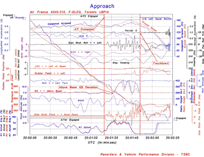 The Air France Airbus A340-313 aircraft (registration F-GLZQ, serial number 0289) departed Paris, France, at 1153 Coordinated Universal Time (UTC) as Air France Flight 358 on a scheduled flight to Toronto, Ontario, with 297 passengers and 12 crew members on board. Before departure, the flight crew members obtained their arrival weather forecast, which included the possibility of thunderstorms. While approaching Toronto, the flight crew members were advised of weather-related delays. On final approach, they were advised that the crew of an aircraft landing ahead of them had reported poor braking action, and Air France Flight 358s aircraft weather radar was displaying heavy precipitation encroaching on the runway from the northwest. At about 200 feet above the runway threshold, while on the instrument landing system approach to Runway 24L with autopilot and autothrust disconnected, the aircraft deviated above the glideslope and the groundspeed began to increase. The aircraft crossed the runway threshold about 40 feet above the glideslope.