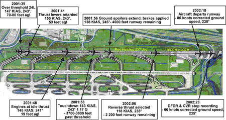 The aircraft touched down at 2001:53, approximately 3800 feet down the 9000-foot runway. On touchdown, the right main landing gear was slightly left of the runway centreline, and the aircraft was crabbed about six degrees to the right. The spoilers deployed automatically, as designed, after the main wheels contacted the runway. The flight crew immediately applied maximum manual braking and attempted to align the aircraft with the centreline. Idle reverse was selected 12.8 seconds after main gear touchdown, and full reverse was selected 16.4 seconds after main gear touchdown. Standard callouts to indicate spoiler and reverser deployment were not made by the PNF. The aircraft was not able to stop on the remaining runway. It departed the end of the runway at a groundspeed of approximately 80 knots and came to rest in a ravine. The aircraft left the runway at 2002:19.