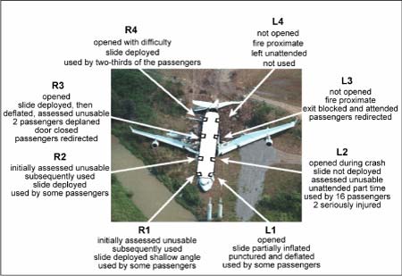 The captain also attempted to check the aircraft for passengers before exiting but was forced to turn back due to smoke as the first officer and the two others were finishing their search for remaining passengers on board. He left the aircraft via the R1 door, and had a difficult time exiting the aircraft because he had sustained back injuries.