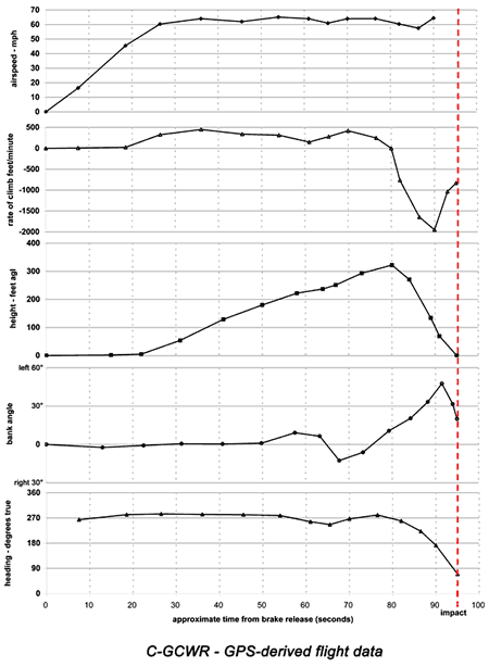The wreckage was taken to the TSB regional examination facility. The instruments and global positioning system (GPS) were removed and examined by the TSB Engineering Laboratory. The vertical speed indicator had a very heavy pointer mark at 830 feet per minute (fpm) down that was attributed to impact, and the airspeed indicator had a faint counter-weight mark in the range of 20 to 40 mph. The GPS yielded time, position, and altitude information indicating that the aircraft climbed at 60 to 65 mph indicated airspeed and reached a maximum height of 322 feet agl before beginning the final dive. The flight path is shown in Appendix A and the flight data derived from the GPS and other known data are presented at Appendix B.