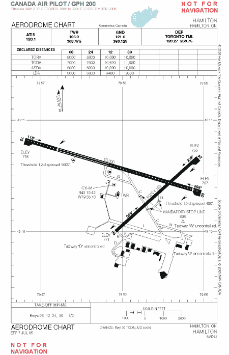Hamilton Airport has two asphalt-surfaced runways (see Appendix B). The runway in use, Runway 12, is 10 000 feet long and 200 feet wide and has a displaced threshold of 1600 feet, leaving a landing distance available of 8400 feet. The ILS or NDB RWY 12 approach is shown in Appendix A. The decision height and advisory visibility for this approach are 980 feet above sea level (asl) (200 feet above ground level (agl)) and ½ statute mile (sm), respectively. The terrain past the end of Runway 12 is level for approximately 25 feet. It then slopes down for approximately 100 feet before it levels to a marshy area.