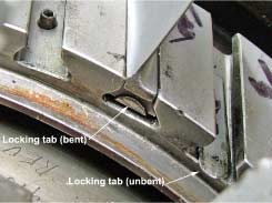 There are 31 blades (part number 1-100-361-06) on the first stage compressor disk. Each blade has a locking tab (part number 1-100-505-02). These are single use only items and should be replaced at each disassembly. The examination revealed that all the locking tabs, locking the blades to the first stage compressor disk, were found unbent (see Photo 2). All of the blades had moved back and there was rotational scoring on all aft blade platforms, with corresponding damage on the outer diameter of the vane support.