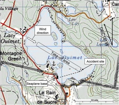 The Cessna 185, registration C-FYZC, serial number 185-1540, operated by Aviation Wheelair, was to make a scenic flight following visual flight rules with a pilot and five passengers on board. The seaplane left the company's wharf at Lac Ouimet, Quebec, then taxied on the surface of the lake for about 500 m. When it reached the take-off area, the seaplane turned left to face into the wind in preparation for take-off. At approximately 1510 eastern daylight time, as the pilot was applying the throttle, the seaplane tipped to the right, the nose of the right float dug into the water, the propeller hit the surface of the lake, and the aircraft capsized. The pilot and four passengers escaped from the cabin. A seaplane from the company and a neighbouring resident in a boat headed to the survivors right away. The survivors were rescued within seven minutes of the accident. The passenger in the right front seat was unable to escape from the submerged cabin and drowned.