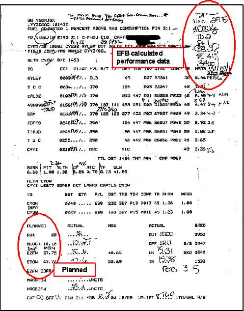 The first page of the operational flight plan lists the planned block fuel, estimated zero fuel weight and estimated take-off weight at the bottom left corner. A designated area situated immediately right of these figures is used to transcribe the final load data. There is no specific area on that same page to transcribe the performance data calculated on the EFB. Crews normally transcribe these data to the top right corner of the page.