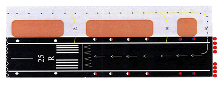 - Taxiways B1 and A2 centrelines curve onto the runway edge line. At night, this could result in pilots aligning their aircraft with the runway side stripe marking instead of with the runway centreline.