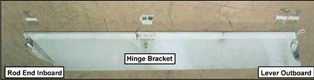 The left centre inboard flap tab is part of the trailing edge flap system (Figure 1). The flap tab is approximately 2.8 m (112 inches) long, 0.6 m (27 inches) wide and weighs approximately 16 kg (35 pounds). The main structural attachment, referred to as the flap tab hinge bracket (hinge bracket), was located mid span on the bottom of the flap tab near the leading edge. The hinge bracket is characterized as a solid lever that transitions to a box section for attachment to the inside of the flap tab. Attachment was accomplished by a combination of PRCFootnote 2-type sealant, rivets, and bolts. The flap tab bottom skin, immediately around the hinge bracket, was covered by a doubler plate. The hinge bracket failed just below the bottom level of the doubler plate in line with the flap tab skin. As well, the flap tab was supported on the inboard end by a rod link and on the outboard end by a lever assembly (Photo 1). The inboard rod link was bent and had failed in overload. The outboard lever assembly was bent and the attachment ball bearing had pulled out of the ball bearing mount.