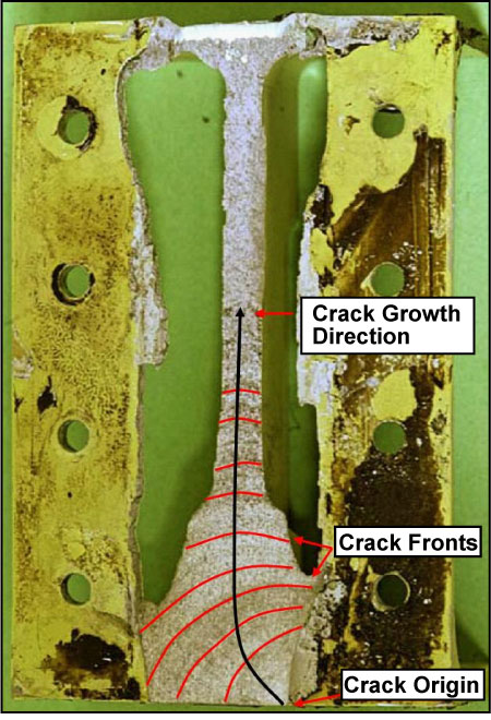 Microscopic examination of the hinge bracket after removal from the flap tab showed that a fatigue crack initiated due to impact damage, measuring approximately 0.5 mm in depth. The impact damage was located at the outboard side of the flap tab hinge bracket in the contour radius at the transition hinge to flange. The fatigue crack propagated over 70 per cent of the cross-sectional area of the hinge bracket (Photo 2). The weakened hinge bracket, unable to sustain the increased aerodynamic flight loads with the flaps extended, failed as the crack length attained critical dimensions. The impact damage, at the origin of the crack, occurred in a location that is protected once the hinge bracket is installed.