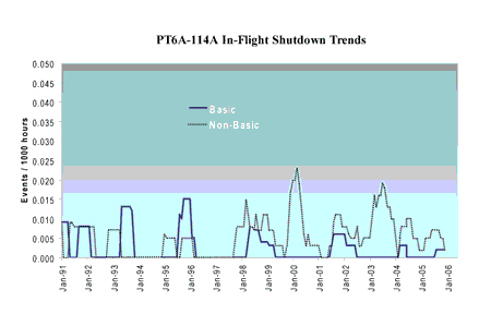 In 2005, the basic IFSD rate for the PT6A-114A engine was about 0.0025 failures per 1000 hours. However, over the same time period, the total IFSD rate for the year, considering all causes, was approximately 0.01 failures per 1000 hours.