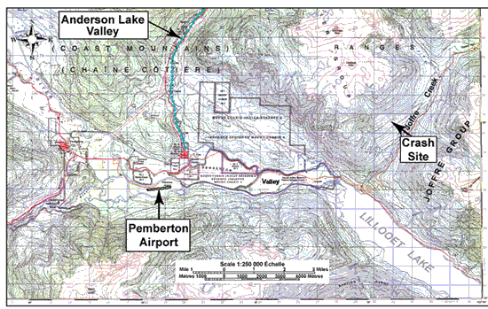The TSB Engineering Laboratory performed a terrain shadow analysis (TSB Engineering Laboratory report LP 065/2006). The accident site location corresponds to a narrowing point at the initial climb section, with the valley about one mile wide at this elevation. This site, on the left side of the valley (southeast-facing slope), was in a large shadow region and had been for a couple of hours before the accident. The mountain peaks in the vicinity of the accident site vary in height between 9150 feet and 8550 feet asl, and there was some snow at higher elevations. The wreckage site coordinates, latitude 50°20′ N and longitude 122°34′ W, correspond to an elevation of approximately 3280 feet asl.