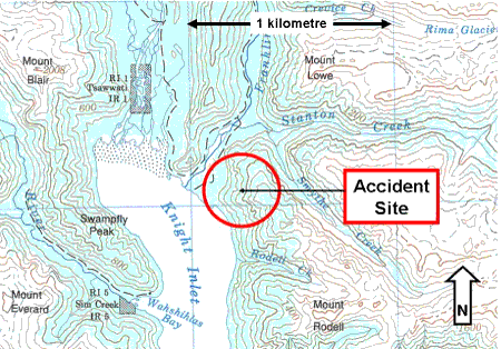 The helicopter was substantially damaged; there was no post-impact fire. The accident site is located at 51°04′24″ N latitude and 125°32′37″ W longitude, at an elevation of about 1350 feet.