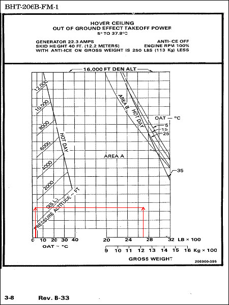 The hover-out-of-ground-effect (HOGE) hover ceiling chart in the Bell 206B RFM provides maximum allowable gross weight for varying conditions of pressure altitude and outside air temperature to ensure that the helicopter can hover without the performance benefit of ground effect. For the conditions at the time of the accident, the HOGE chart showed that the weight of the helicopter with the three occupants on board would have been well within the out-of-ground-effect performance capability of the helicopter (see Appendix B).