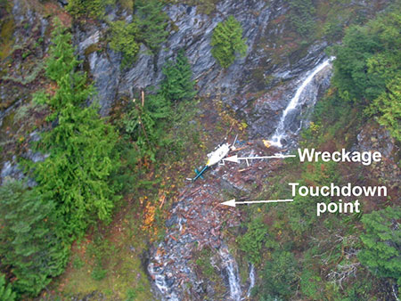 The landing site was a terraced ledge, about 40 feet wide, in a steep gorge on the west face of the mountain, and adjacent to a rapidly flowing waterfall. The site was surrounded by tall trees and almost-vertical rock faces, and the landing surface consisted mainly of loose rock and forest debris, constantly wet from the waterfall flow. The distance from the touchdown point to the waterfall rock face was about 50 feet, and the helicopter ended up about 20 feet away from the waterfall (see Photo 1).