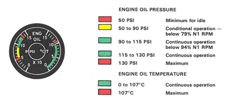 The Bell 206L-3 has a gauge that allows the pilot to determine the status of the engine oil system (see Figure 1). It shows the engine oil pressure and temperature. However, there is no caution light to warn of low engine oil pressure or high engine oil temperature. When an abnormal condition occurs, the pilot must determine how serious it is based on the engine oil temperature and pressure. The pilot must then follow the appropriate procedure recommended in the helicopter's flight manual. Engine oil pressure outside the prescribed limits indicates either a fault in the engine oil circulation system, a low engine oil level, or a system indication problem. Since the engine oil temperature sensor is located directly at the oil tank outlet, it is possible for the oil temperature to indicate normal even when the oil level is low. Three limiting ranges for engine oil pressure are defined according to the rpm of the engine's low-pressure compressor (N1 RPM), with N1 being proportional to the engine power delivered.