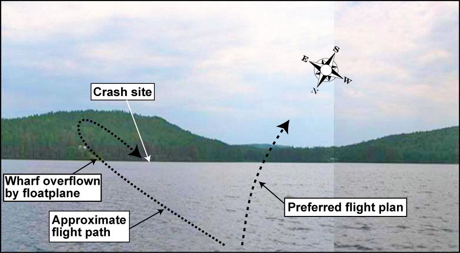 Rather than following the suggested flight path, the aircraft took off more or less into the wind in a southwesterly direction. Shortly after becoming airborne near the western shore of the lake, the aircraft turned left heading east with a tailwind, and headed directly towards the departure wharf (see Photo 1). About 1700 feet separated the two shores of the lake where the turn was made. After flying over the wharf, the aircraft stalled and crashed 300 feet to the south. The engine continued to operate for a short time.