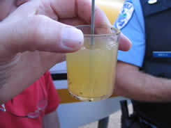 The aircraft was examined at the accident site, and a few water droplets were initially collected from the right wing tank drain valve. The left tank could not be drained because the dented wing skin obstructed the access to the drain valve. The gascolator bowl in the engine compartment was drained, and 5 to 6-ounces of yellowish water was collected (see Photo 1).