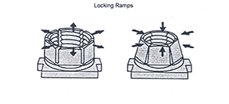 The upper left attachment bolt had pulled through the locknut. The threads of both the bolt and the locknut show damage consistent with a shearing motion. The upper left attachment bolt was fully engaged and extended through the nut by three to four threads. The locknut has six flexible beams (Figure 3 locking ramps) that provide the locking function as the bolt is tightened. One of the six beams was broken off, and a second beam was cracked but still attached; it broke off when slight finger pressure was applied. A third beam had several small cracks emanating from the inner surface. Cracking was evident in all three beams emanating from the roots of the internal threads, initiating and leading from the corners formed by the intersection of the threads with the vertical cut slots. The TSB Engineering Laboratory confirmed the cracking was due to fatigue. The exposed surfaces of the cracks had rub markings, which destroyed any fine detail of the nature of the fatigue.