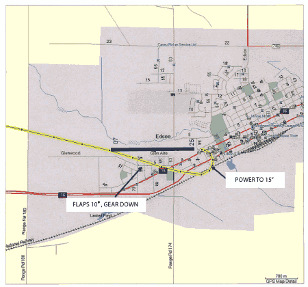 At 1307, the aircraft was approximately five nautical miles (nm) west of Edson Airport (elevation 3041 feet asl) at 2000 feet agl, tracking 95°M toward the left-hand downwind for Runway 25. The aircraft was descending at 800 feet per minute (fpm) with a ground speed of about 120 knots (surface winds were 313°M at 7 knots). During the next minute, the pilot selected the landing gear down, and 10° of flap.