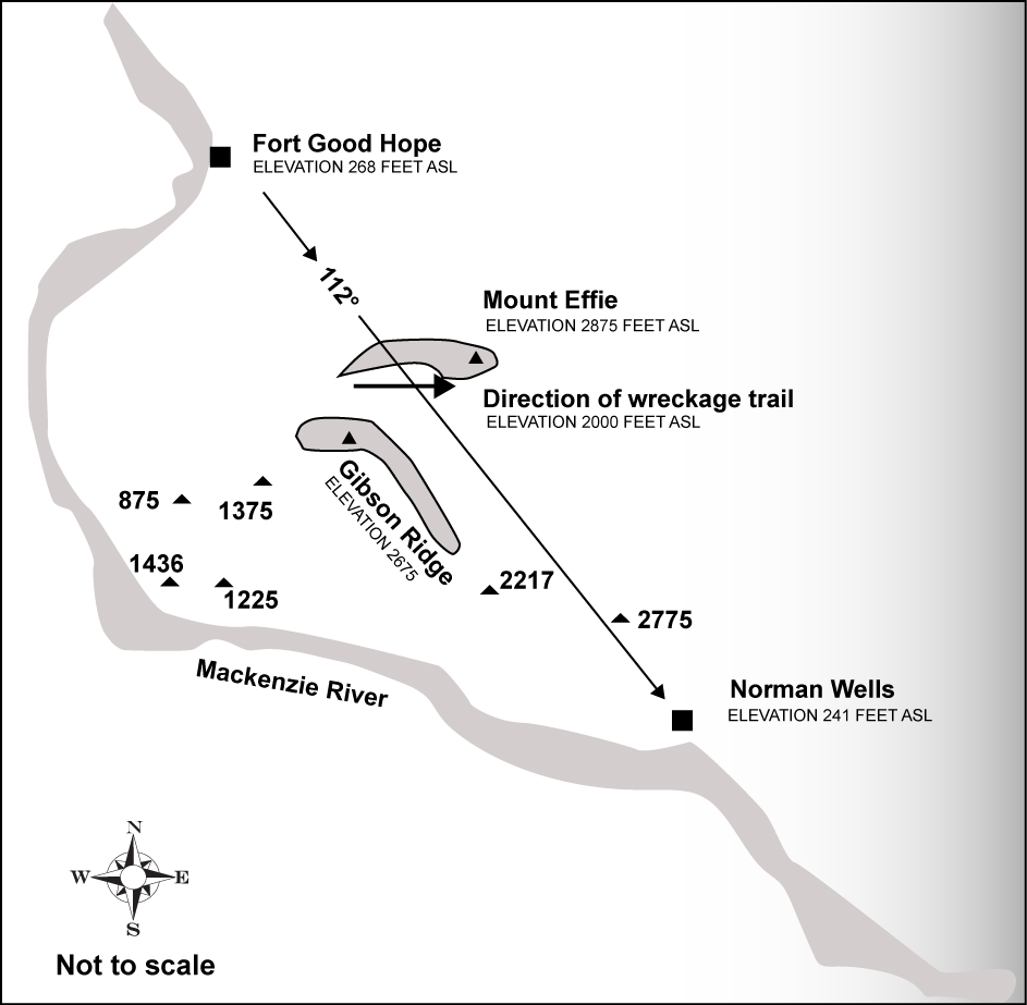 At 1345, the company initiated its overdue aircraft response, which included a radio communication search, followed by the dispatching of company aircraft at 1430. The wreckage site was located at 1616 on the southern slope of Mount Effie, 23 nm southeast of Fort Good Hope (see Figure 2).