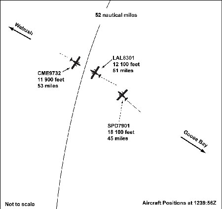Air traffic control services at Goose Bay, Newfoundland and Labrador, are provided by Serco Facilities Management Inc., a company under contract to the Department of National Defence. The inbound Prince Edward Air Beech 1900, operating as Comet 9732, was descending from flight level 210 through 13 000 feet, approximately 65 nautical miles (nm) west of Goose Bay. An outbound Air Labrador de Havilland DHC-8, operating as Labair 8301, was in level cruise flight at 12 000 feet when the crew received a traffic alert and collision-avoidance system resolution advisory. The two aircraft passed each other 50 nm west of Goose Bay with approximately 1.8 nm lateral and 300 feet vertical spacing, where 3 nm lateral or 1000 feet vertical spacing is required. Weather at the time was clear with unlimited visibility. Both aircraft were flying under instrument flight rules, and under the control of Goose Bay terminal control.