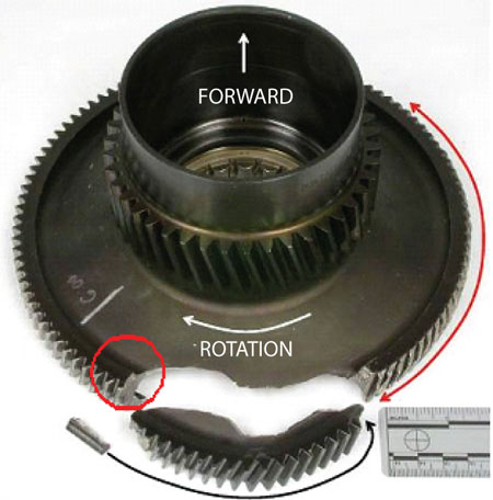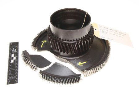 Examination of the gearbox revealed that a section of the helical torquemeter gearshaft (hereinafter referred to as the torquemeter gear), part number 6893673-W, serial number NN144767, had separated and was found detached inside the gearbox.
