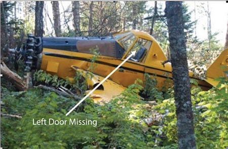 The pilot remained onboard the aircraft for a few minutes as he attempted to radio the company base. Between transmissions, the pilot could hear interference from the emergency locator transmitter (ELT) signal in his headset. This inhibited his ability to detect if anyone at the base had acknowledged the transmission. In an attempt to shut off the ELT and silence the interference, he tried to locate the unit, but without success. The ELT placard is located on the outside of the left-side cockpit door. The placard was not visible because the door had become detached from the aircraft and was lying on the forest floor with the placard side down.