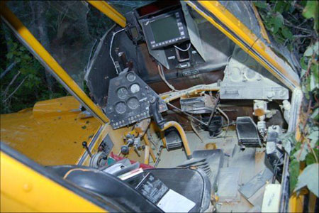 As the aircraft entered the trees in a right-wing-low attitude, it began to decelerate and yaw further to the right. Several large trees were broken off in the accident sequence, which caused damage to both wings, the tail section, fuselage, empennage, propeller, and engine. The pilot, who was wearing a four-point safety harness, was not injured. The cockpit integrity was not compromised.