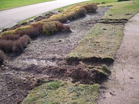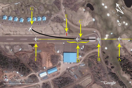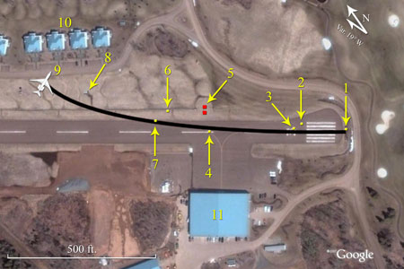 The left main landing gear tire tracks cross the centreline 457 feet from the threshold. A runway edge light located 600 feet from the threshold was broken. A ground scar indicates that the right main landing gear departed the runway surface 640 feet from the threshold (see Photo 3) while the left main landing gear departed the runway surface 694 feet from the threshold.