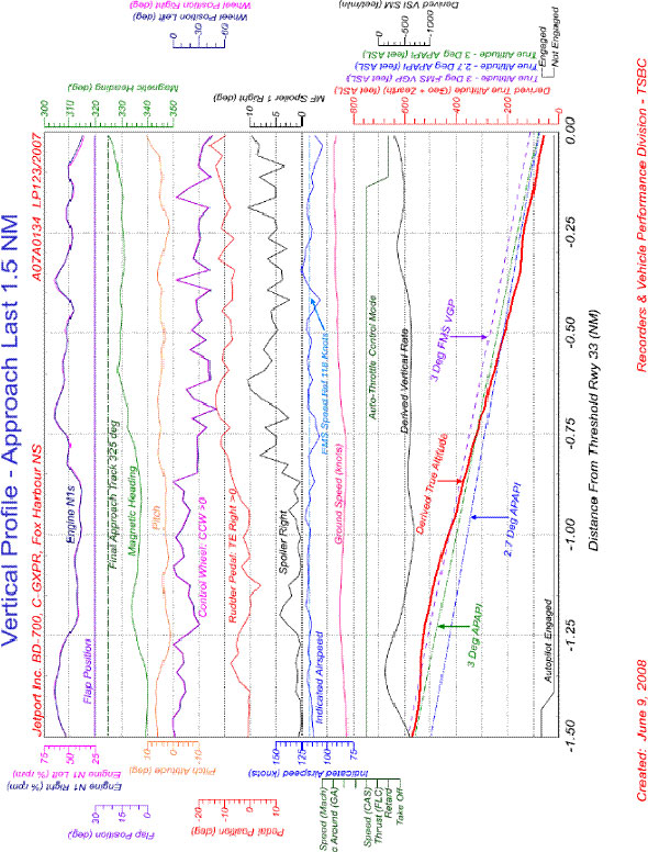 At 1430:53, five nautical miles (nm) from the threshold of Runway 33, the aircraft crossed the final approach fix at an altitude of 1680 feet above sea level (asl). At that point, the crew had the runway in sight. At 4.4 nm, the APAPI was visible to the crew. At this time, the aircraft was configured for landing and stabilized on approach, following FMS vertical path guidance.