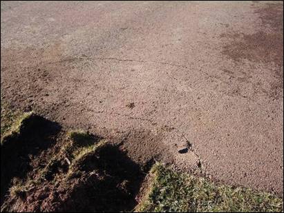 The tire tracks leading up to the paved asphalt runway surface were approximately five inches deep. Two semi-circular cracks were found in the asphalt, in line with the right main landing gear touchdown point (see Photo 2), resulting from the force of the gear striking the runway edge.