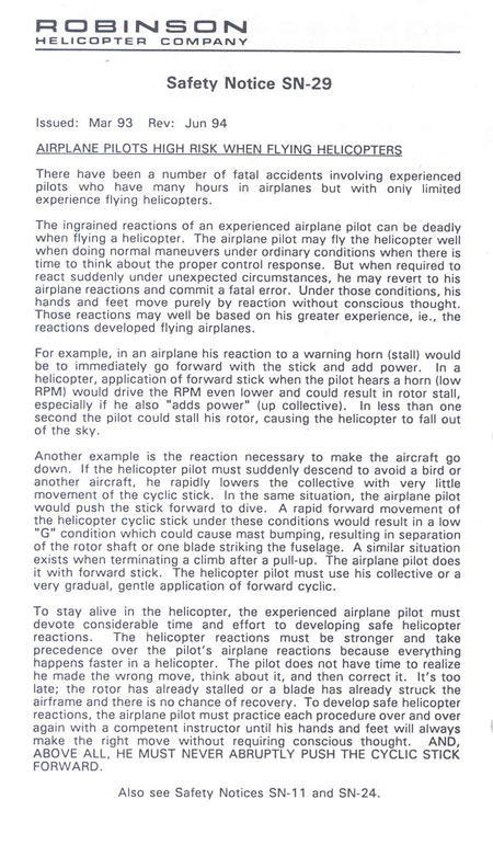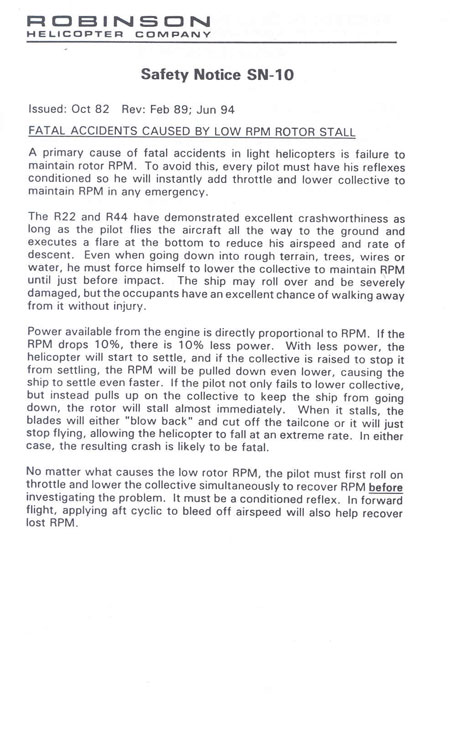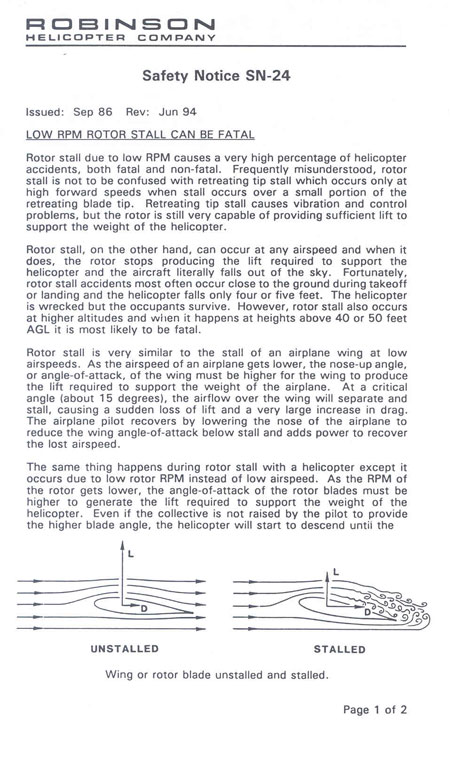 As a result of various accidents and incidents, the Robinson Helicopter Company has issued numerous safety notices. Safety Notice SN-10 states: "A primary cause of accidents in light helicopters is failure to maintain rotor RPM." Low RPM rotor stall can occur at any airspeed and when it does, the rotor stops producing the lift required to support the helicopter. Safety Notice SN-10 further states: "When the rotor stalls, the blades will either 'blow back' or cut off the tail cone or the rotor will just stop flying, allowing the helicopter to fall at an extreme rate." The following safety notices are relevant to this occurrence and have been included as Appendices to the report: