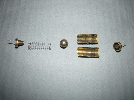 The G-switch, part number 2014-1-000, was manufactured by Select Controls Inc. It is a single-axis, ball and spring-type switch, with the ball and spring contained within a casing (see Photos 2 and 3). The ELT is activated when G-forces are sufficient for the ball to compress the spring and touch a contact inside the front of the casing. Examination showed that the ball was seized in the midway position within the casing and had partially compressed the spring. Attempts to shake the ball loose were unsuccessful.