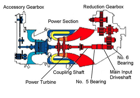 The helicopter was powered by a "Twin-Pac"" ® that consisted of two Pratt & Whitney Canada PT6T-3B engines (referred to by the manufacturer as "power sections") coupled to a single Pratt & Whitney Canada reduction gearbox (also referred to as the "combining gearbox"). Coupling shafts between the power sections and RGB connect the power turbines (PTs) to the number one and number two main input driveshafts. Each main input driveshaft is supported on its forward end by a number five duplex ball bearing and on its aft end by a number six roller bearing. The PTs, coupling shafts, main input driveshafts, and their associated bearings operate at about 33 000 revolutions per minute.