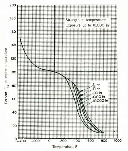 The 2024 series of aluminium alloy has material properties that tend to degrade as a result of exposure to elevated temperatures. For example, at elevated temperatures these alloys have reduced yield strength as shown in Figure 1. Furthermore, the time exposed to higher temperatures has a cumulative effect, reducing yield strength even further. In addition to reduced yield strength, exposure to elevated temperature reduces the modulus of elasticity, a measure of stiffness. For example, in the range 400 to 499°F (204 to 259°C), the temperatures measured during the temperature survey, the modulus of elasticity drops to about 81 per cent of its room temperature value.
