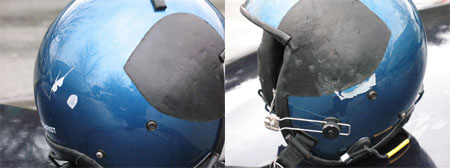 The impact damage to the flying pilot's helmet shows that the helmet prevented more serious head injuries (see Photo 7). Had he been able to wear the available shoulder harness, the injuries he did receive would likely have been less severe.