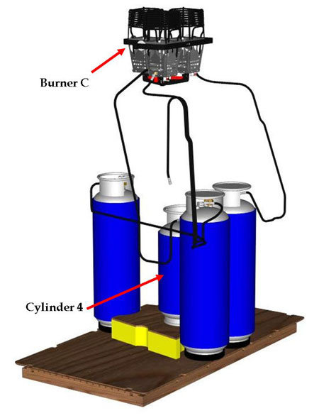 - The fuel line connecting the number 4 cylinder to burner C became disconnected at the tank valve connection, probably due to a combination of age, wear, handling, and allowing propane under pressure to be expelled. The propane was ignited either by flame from the test burn just made from burner C or from the pilot light.