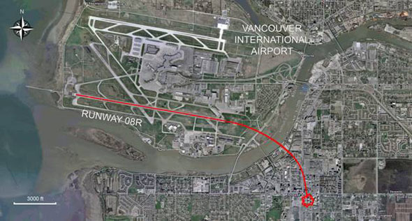 Pitt Meadows Regional Airport is about 19 nautical miles (nm) east-northeast of the Vancouver International Airport, but the pilot requested a southbound departure in order to check some maintenance work that had recently been done on the aircraft. The flight was approved for the published Vancouver VOR Footnote 1 departure from Runway 08 Right (R08R), which requires a right turn, at pilot's discretion, to a heading of 160° magnetic toward the Vancouver VOR (7 nm south) and to climb to 2000 feet above sea level (asl). When climbing through 1000 feet asl, the pilot is required to change from the inner to the outer south tower frequency.