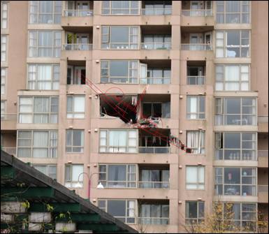 The aircraft entered the residential building in a right bank (see Photo 1). The left engine entered the apartment building with the fuselage through a large window. The right engine directly impacted the building's 9th floor exterior concrete wall, separated from the aircraft, and fell to the 4th floor parking lot. Damage signatures from the right engine showed the last one half of a revolution during the impact before stopping. The right engine was severely damaged and could not be disassembled. An examination was conducted on the left engine and did not reveal any evidence of pre-impact damage that would have prevented normal operation.