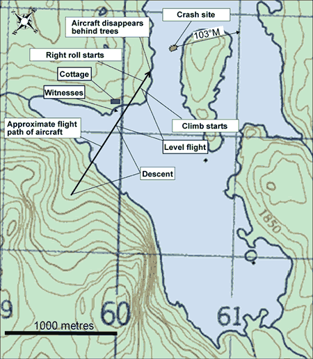 Over the north shore of the bay, the aircraft initiated a gentle climb followed by a steep bank, then disappeared behind the trees. The aircraft roughly followed the west shore of the lake as it moved farther away from the cottage. The noise of an impact was heard a few seconds later. A few minutes after that, the aircraft was found broken up on the frozen surface of the lake.