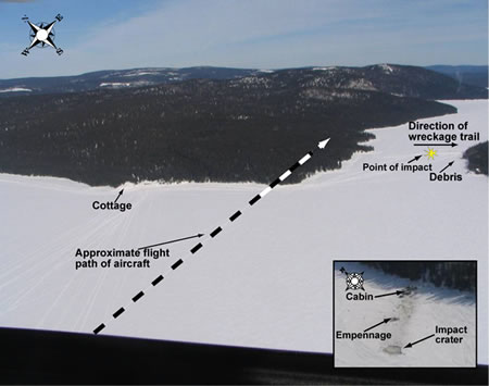 The accident occurred on the frozen surface of the southeast bay of Grand lac Germain, at an elevation of 1780 feet ASL. The aircraft struck the frozen surface of the lake 525 feet east of the shoreline it was flying over and 275 feet west of an island in the middle of the bay. The aircraft crashed approximately 2300 feet northeast of the cottage and 1600 feet after disappearing behind the trees. The aircraft broke through the top layer of ice, which was about two inches thick, then bounced off the second layer of ice. The impact produced a crater 30 feet in circumference.