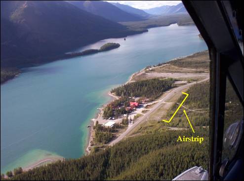 The company used two gravel airstrips at Muncho Lake. The lodge airstrip was located at Mile 462 of the Alaska Highway, within the highway right-of-way, immediately across from the Northern Rockies Lodge. This airstrip was at 2750 feet above sea level (asl) and it was oriented southeast/northwest. A post-accident survey determined that it was about 950 feet long and sloping upward about 2° in the northwest direction. Take-offs were usually accomplished towards the northwest due to high terrain to the southeast. The Alaska Highway crossed diagonally under the climb-out corridor approximately 100 feet beyond the northwest threshold.