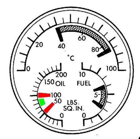 Aircraft manufacturers consider any instrument gauge green arc to be the normal operating range. However, industry practice for the Beaver aeroplane equipped with the P&W R985 indicates that the engine can be safely operated as long as the oil pressure is within the 50 to 100 psi range (between the two red arcs on the oil pressure gauge).