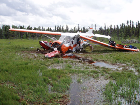 The force at impact was enough to cause major structural damage to the engine mount, cowlings, left wing, and both floats. The cushioning effect of the bog prevented more serious damage and helped the Beaver rebound out of the initial impact point to the position shown in Photo 1. The impact forces were strong enough to cause serious injury to some passengers.